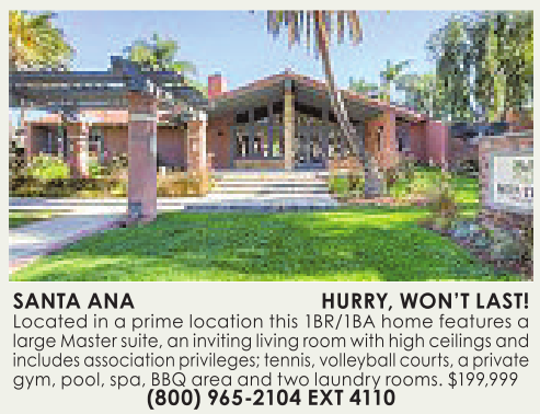 SANTA ANA HURRY, WON’T LAST! Located inaprime location this 1BR/1BA home features alargeMastersuite,aninvitingliving room with high ceilingsand includes associationprivileges; tennis,volleyballcourts, aprivate gym, pool, spa, BBQ area and twolaundry rooms. $199,999 (800)965-2104 EXT 4110