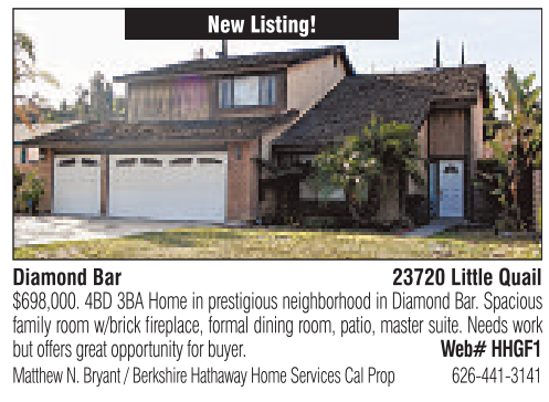 New Listing! Diamond Bar 23720 Little Quail $698,000. 4BD 3BAHome in prestigiousneighborhoodinDiamondBar.Spacious family room w/brick fireplace, formal dining room, patio, mastersuite.Needs work butoffers great opportunity forbuyer. Web# HHGF1 Matthew N. Bryant /BerkshireHathawayHomeServices Cal Prop 626-441-3141