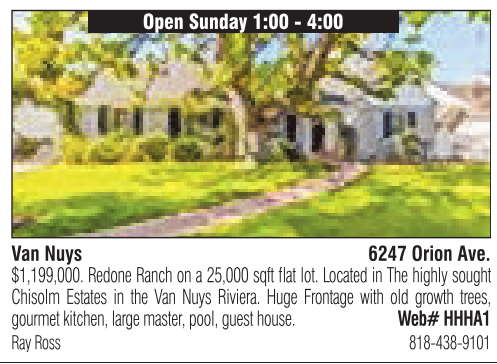 Open Sunday 1:00 -4:00 Van Nuys 6247 Orion Ave. $1,199,000. Redone Ranch on a25,000sqftflat lot.Located in Thehighly sought Chisolm Estates in the Van Nuys Riviera. Huge Frontage with old growth trees, gourmet kitchen, largemaster, pool, guest house. Web# HHHA1 Ray Ross 818-438-9101