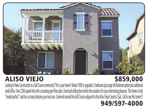 ALISO VIEJO $859,000 Lookingfor NewConstructioninaGolf Course community?This is your home!! Almost 100K in upgrades! 3bedrooms plus large loft/bedroomoption plus additional small office. Over 2200 square feet withastunningopen floorplan.Oversizedsliding door invites theoutside in for your entertainingpleasure. This home is truly “modelperfect”and has so many featuresyou mustsee.Centeredaroundthe Golf Course adjacent to theAlisoViejo Country Club.Call to seethis home!!! 949/597-4000