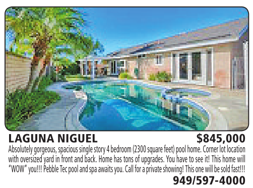 LAGUNA NIGUEL $845,000 Absolutelygorgeous,spacioussinglestory4bedroom(2300 square feet)poolhome.Corner lotlocation with oversized yard infront and back. Home has tons ofupgrades. You have to see it! This home will “WOW”you!!! Pebble Tecpooland spaawaitsyou. Call for aprivate showing! This one will be sold fast!!! 949/597-4000