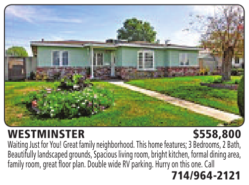 WESTMINSTER $558,800 WaitingJust for You! Greatfamily neighborhood. This home features; 3Bedrooms,2Bath, Beautifully landscaped grounds, Spacious living room,brightkitchen, formal diningarea, family room,great floorplan. Double wide RV parking. Hurryonthis one.Call 714/964-2121