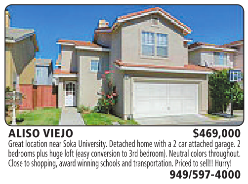 ALISO VIEJO $469,000 Great location near Soka University. Detached home with a2car attached garage. 2bedrooms plus huge loft (easy conversion to3rd bedroom). Neutral colors throughout. Close to shopping,award winningschoolsand transportation. Priced to sell!! Hurry! 949/597-4000