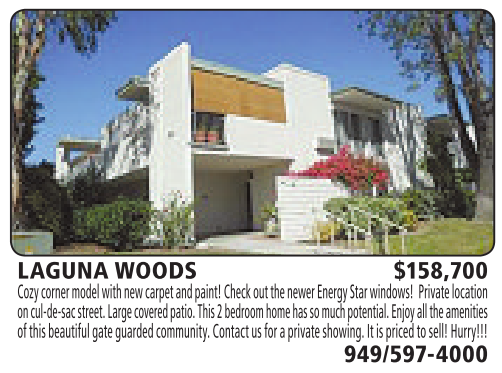 LAGUNA WOODS $158,700 Cozy corner model with new carpet and paint!Check outthe newer Energy Star windows! Private location on cul-de-sacstreet. Large coveredpatio.This 2bedroomhomehas so much potential. Enjoy allthe amenities of this beautiful gate guardedcommunity. Contactusfor aprivateshowing. It is pricedtosell! Hurry!!! 949/597-4000