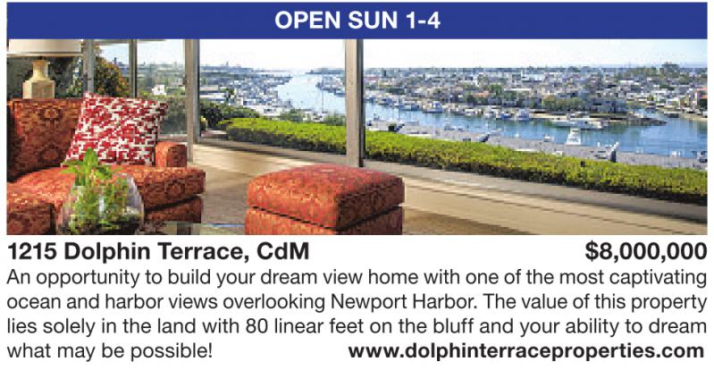 OPEN SUN 1-4 1215 Dolphin Terrace, CdM $8,000,000 An opportunity to build your dream view home with one of the most captivating ocean and harbor views overlooking Newport Harbor. The value of this property lies solely in the land with 80 linear feet on the bluff and your ability to dream what may be possible! www.dolphinterraceproperties.com See also