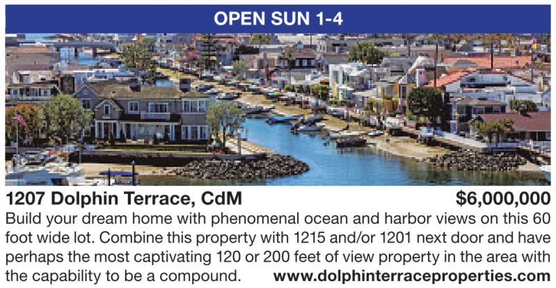 OPEN SUN 1-4 1207 Dolphin Terrace, CdM $6,000,000 Build your dream home with phenomenal ocean and harbor views on this 60 foot wide lot. Combine this property with 1215 and/or 1201 next door and have perhaps the most captivating 120 or 200 feet of view property in the area with the capability to be a compound. www.dolphinterraceproperties.com See also