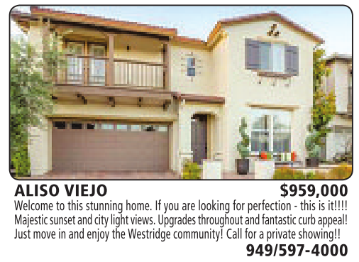ALISO VIEJO $959,000 Welcome to this stunning home. Ifyou are looking for perfection -this is it!!!! Majesticsunset andcitylight views. Upgrades throughout andfantasticcurbappeal! Just move in andenjoy theWestridge community! Call for aprivateshowing!!