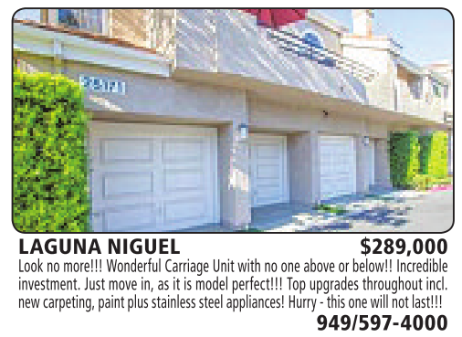 LAGUNA NIGUEL $289,000 Look nomore!!! Wonderful Carriage Unit with noone above or below!! Incredible investment. Just move in, asitismodel perfect!!! Top upgrades throughout incl. new carpeting,paintplusstainlesssteel appliances! Hurry -this one will notlast!!! 949/597-4000 See also