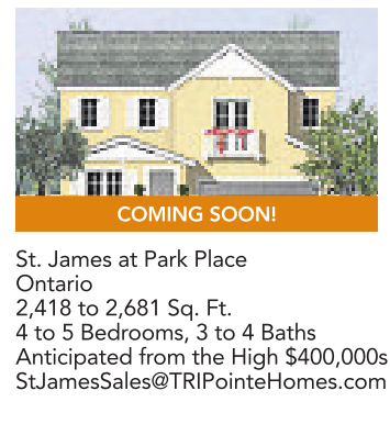 St. James atPark Place Ontario 2,418 to 2,681 Sq. Ft. 4to5Bedrooms, 3to 4Baths Anticipated from the High $400,000s StJamesSales@TRIPointeHomes.com