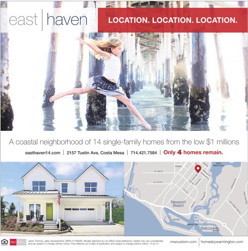 Jason Thomas, sales representative, BRE# 01166495. Models depicted do not reflect racial preference. Details may vary considerably and are subject to change without notice. Price effective as of date of publication and subject to change without notice. 10.22.14 LOCATION. LOCATION. LOCATION. A coastal neighborhood of 14 single-family homes from the low $1 millions easthaven14.com | 2157 Tustin Ave, Costa Mesa | 714.421.7584 | Only 4 homes remain. 1 W. 19th St. St. W.BaySt. Newport Beach LIDO ISLE mwcustom.com NEWPORT BAY Balboa UPPER NEWPORT BAY BALBOA ISLAND homesbywarmington.com 1