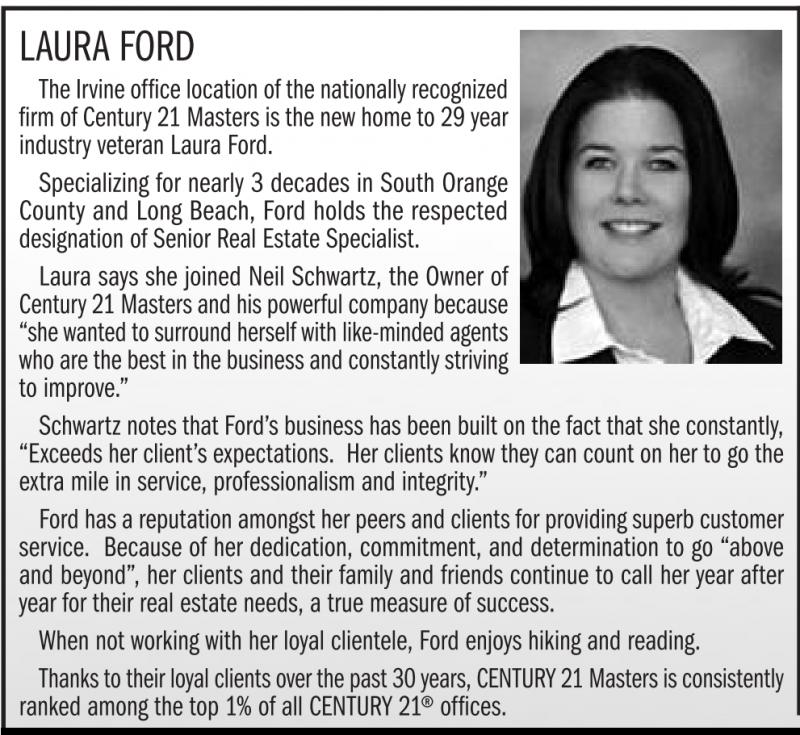 LAURA FORD The Irvine office location of the nationally recognized firm of Century 21 Masters is the new home to 29 year industry veteran Laura Ford. Specializing for nearly 3 decades in South Orange County and Long Beach, Ford holds the respected designation of Senior Real Estate Specialist. Laura says she joined Neil Schwartz, the Owner of Century 21 Masters and his powerful company because “she wanted to surround herself with like-minded agents who are the best in the business and constantly striving to improve.” Schwartz notes that Ford’s business has been built on the fact that she constantly, “Exceeds her client’s expectations. Her clients know they can count on her to go the extra mile in service, professionalism and integrity.” Ford has a reputation amongst her peers and clients for providing superb customer service. Because of her dedication, commitment, and determination to go “above and beyond”, her clients and their family and friends continue to call her year after year for their real estate needs, a true measure of success. When not working with her loyal clientele, Ford enjoys hiking and reading. Thanks to their loyal clients over the past 30 years, CENTURY 21 Masters is consistently ranked among the top 1% of all CENTURY 21® offices.