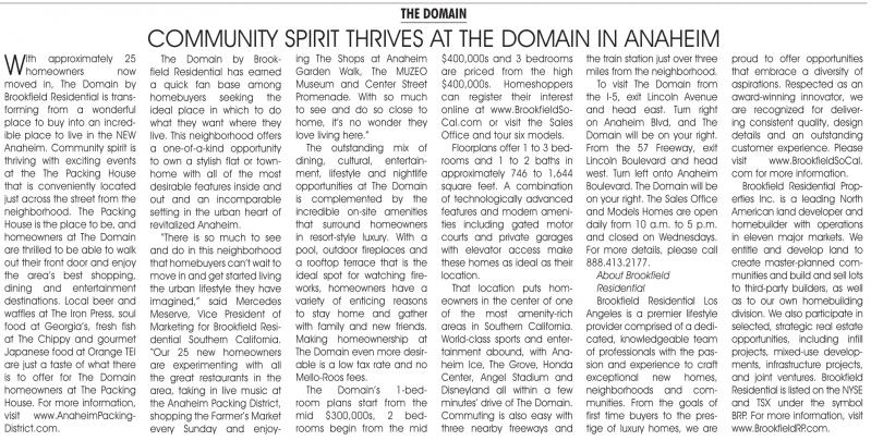 approximately 25 homeowners now moved in, The Domain by Brookfield Residential is transforming from a wonderful place to buy into an incredible place to live in the NEW Anaheim. Community spirit is thriving with exciting events at the The Packing House that is conveniently located just across the street from the neighborhood. The Packing House is the place to be, and homeowners at The Domain are thrilled to be able to walk out their front door and enjoy the area’s best shopping, dining and entertainment destinations. Local beer and waffles at The Iron Press, soul food at Georgia’s, fresh fish at The Chippy and gourmet Japanese food at Orange TEI are just a taste of what there is to offer for The Domain homeowners at The Packing House. For more information, visit www.AnaheimPacking- District.com.