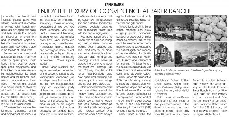 addition to brand new homes, scenic parks with athletic fields and resort-style amenities, Baker Ranch residents are privileged with quick and easy access to a bounty of shopping, entertainment and recreational opportunities which surround this scenic community now taking shape in the foothills of Lake Forest.