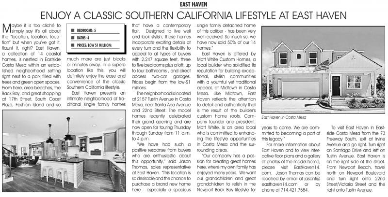 For more information about East Haven and to view interactive floor plans and agallery of photos of the model home, please visit EastHaven14. com. Jason Thomas can be reached by email at jasont@ easthaven14.com or by phone at 714.421.7584.