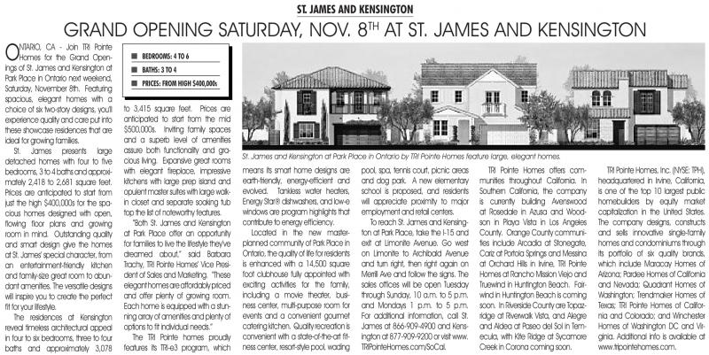 Ca - join TRI Pointe Homes for the Grand Openings of St. james and kensington at Park Place in Ontario next weekend,
