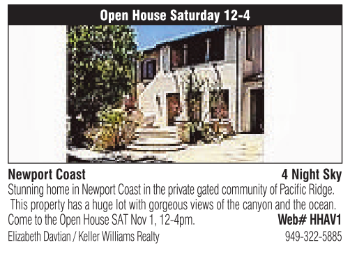 NewportCoast Open House Saturday 12-4 4Night Sky Elizabeth Davtian /Keller Williams Realty 949-322-5885 Stunning home in NewportCoast in the private gated community of Pacific Ridge. This property has ahuge lot with gorgeous views of the canyon and the ocean. Come to the Open House SAT Nov 1, 12-4pm. Web# HHAV1