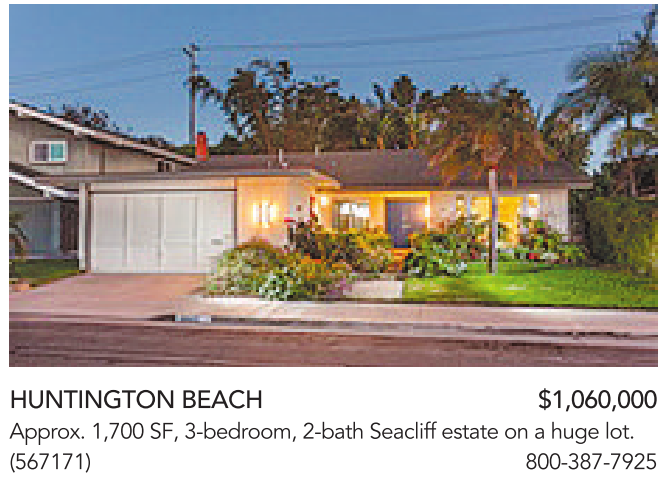 HUNTINGTON BEACH $1,060,000 Approx. 1,700 SF, 3-bedroom, 2-bath Seacliff estate on ahuge lot. (567171) 800-387-7925