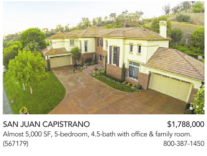 SAN JUAN CAPISTRANO $1,788,000 Almost 5,000 SF, 5-bedroom, 4.5-bath with office &family room. (567179) 800-387-1450