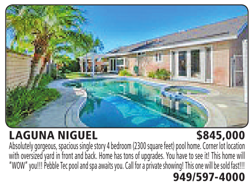 LAGUNA NIGUEL $845,000 Absolutelygorgeous,spacious single story4bedroom(2300square feet)poolhome. Corner lotlocation with oversized yard infront and back. Home has tons of upgrades. You have to see it! This home will “WOW” you!!! Pebble Tecpooland spaawaitsyou. Call foraprivate showing! This one will be sold fast!!! 949/597-4000 See also