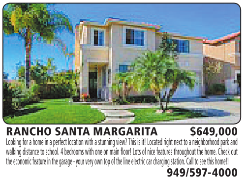 RANCHO SANTA MARGARITA $649,000 Looking for ahome in aperfect location with astunning view? This is it! Located right next toaneighborhood park and walking distance toschool. 4bedrooms with one on main floor! Lots ofnice features throughout the home. Check out the economicfeature in the garage-your very owntop of thelineelectriccar charging station. Call to see this home!! 949/597-4000 See also