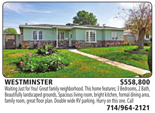 WESTMINSTER $558,800 WaitingJust for You! Greatfamily neighborhood. This home features; 3Bedrooms, 2Bath, Beautifully landscaped grounds,Spaciousliving room,brightkitchen, formal diningarea, family room,great floorplan. Double wide RV parking. Hurryonthis one.Call 714/964-2121