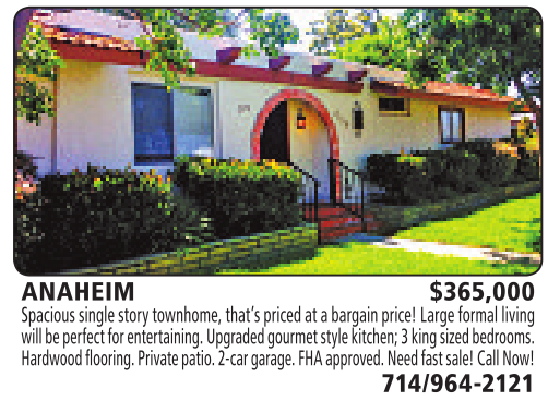 ANAHEIM $365,000 Spacious single storytownhome,that’spricedatabargain price!Large formal living will be perfectfor entertaining. Upgraded gourmet stylekitchen;3kingsized bedrooms. Hardwood flooring.Privatepatio.2-car garage.FHA approved. Needfastsale! Call Now! 714/964-2121 See also