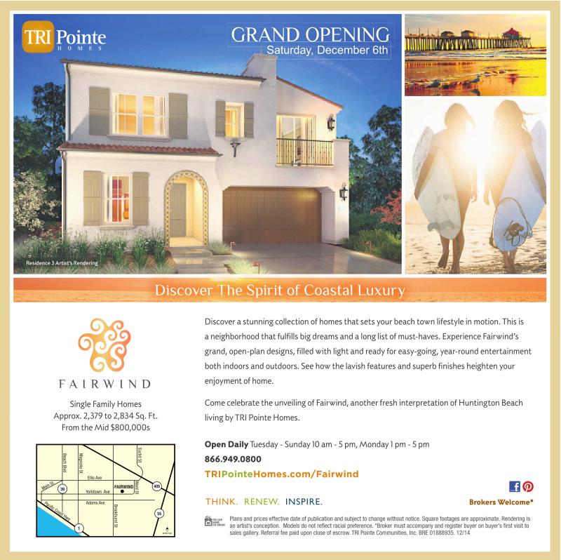 GRAND OPENING Saturday, December 6th Residence 3Artist’sRendering Discover The Spirit of Coastal Luxury Discover a stunning collection of homes that sets your beach town lifestyle in motion. This is a neighborhood that fulfills big dreams and a long list of must-haves. Experience Fairwind’s grand, open-plan designs, filled with light and ready for easy-going, year-round entertainment both indoors and outdoors. See how the lavish features and superb finishes heighten your enjoyment of home. Single Family Homes Approx. 2,379 to 2,834 Sq. Ft. From the Mid $800,000s 39 1 Ellis Ave Yorktown Ave Adams Ave FAIRWIND 405 55 Come celebrate the unveiling of Fairwind, another fresh interpretation of Huntington Beach living by TRI Pointe Homes. Open Daily Tuesday - Sunday 10 am - 5 pm, Monday 1 pm - 5 pm 866.949.0800 TRIPointeHomes.com/Fairwind THINK. RENEW. INSPIRE. BrokersWelcome* Plans and prices effective date of publication and subject to change without notice. Square footages are approximate. Rendering is an artist’sconception. Models do not reflect racial preference. *Broker must accompanyand register buyer on buyer’sfirst visit to sales gallery. Referral fee paid upon close of escrow. TRI Pointe Communities, Inc. BRE 01888935. 12/14