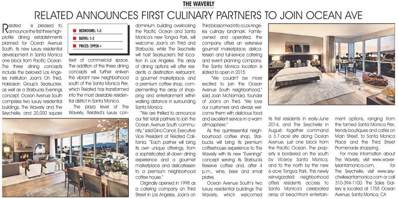 planned for Ocean Avenue South, its new luxury residential development in Santa Monica one block from Pacific Ocean. The three dining concepts include the beloved Los Angeles institution Joan’s On Third, Hakkasan Group’s Searsucker, as well as a Starbucks Evenings concept. Ocean Avenue South comprises two luxury residential buildings, The Waverly and The Seychelle, and 20,000 square