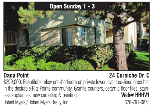 Dana Point Open Sunday 1-3 24 Corniche Dr. CRobertMyers /RobertMyers Realty, Inc. 626-791-0878 $299,000.Beautiful turnkey one-bedroom on private lower leveltree-linedgreenbelt in the desirableRitz Pointe community.Granitecounters, ceramic floortiles,stainlessappliances, new carpeting &painting. Web# HHHV1