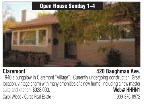Claremont Open House Sunday 1-4 420 Baughman Ave. Carol Wiese /Curtis Real Estate 909-376-8972 1940’s bungalow in Claremont “Village”. Currently undergoing construction. Great location, vintagecharm with manyamenities of anew home, including anew master suite and kitchen. $928,000. Web# HHHN1