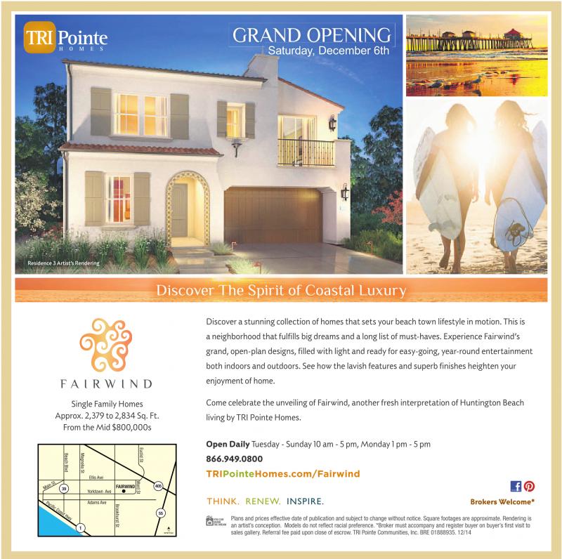 Plans and prices effective date of publication and subject to change without notice. Square footages are approximate. Rendering is an artist’sconception. Models do not reflect racial preference. *Broker must accompanyand register buyer on buyer’sfirst visit to sales gallery. Referral fee paid upon close of escrow. TRI Pointe Communities, Inc. BRE 01888935. 12/14