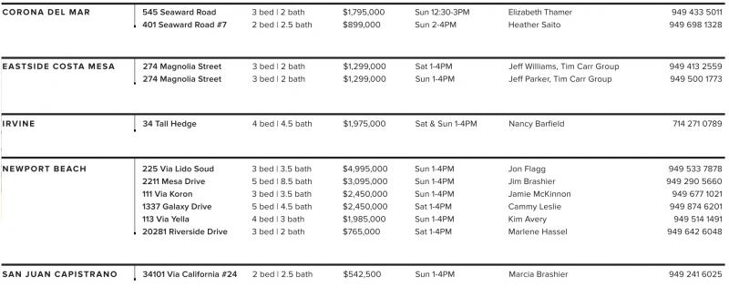 NEWPORT BEACH 225 Via Lido Soud 3 bed | 3.5 bath $4,995,000 Sun 1-4PM Jon Flagg 949 533 7878 2211 Mesa Drive 5 bed | 8.5 bath $3,095,000 Sun 1-4PM Jim Brashier 949 290 5660 111 Via Koron 3 bed | 3.5 bath $2,450,000 Sun 1-4PM Jamie McKinnon 949 677 1021 1337 Galaxy Drive 5 bed | 4.5 bath $2,450,000 Sat 1-4PM Cammy Leslie 949 874 6201 113 Via Yella 4 bed | 3 bath $1,985,000 Sun 1-4PM Kim Avery 949 514 1491 20281 Riverside Drive 3 bed | 2 bath $765,000 Sat 1-4PM Marlene Hassel 949 642 6048