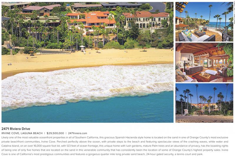 IRVINE COVE, LAGUNA BEACH | $29,500,000 | 2471riviera.com Likely one of the most valuable oceanfront properties in all of Southern California, this gracious Spanish Hacienda style home is located on the sand in one of Orange County’s most exclusive private beachfront communities, Irvine Cove. Perched perfectly above the ocean, with private steps to the beach and featuring spectacular views of the crashing waves, white water and Catalina Island, on an over 16,000 square foot lot, with 123 feet of ocean frontage, this unique home with lush gardens, mature Palm trees and an abundance of privacy, has the boasting rights of being one of only five homes that are located on the sand in this venerable community that has consistently been the location of some of Orange County’s highest property sales. Irvine Cove is one of California’s most prestigious communities and features a gorgeous quarter mile long private sand beach, 24-hour gated security, a tennis court and park.