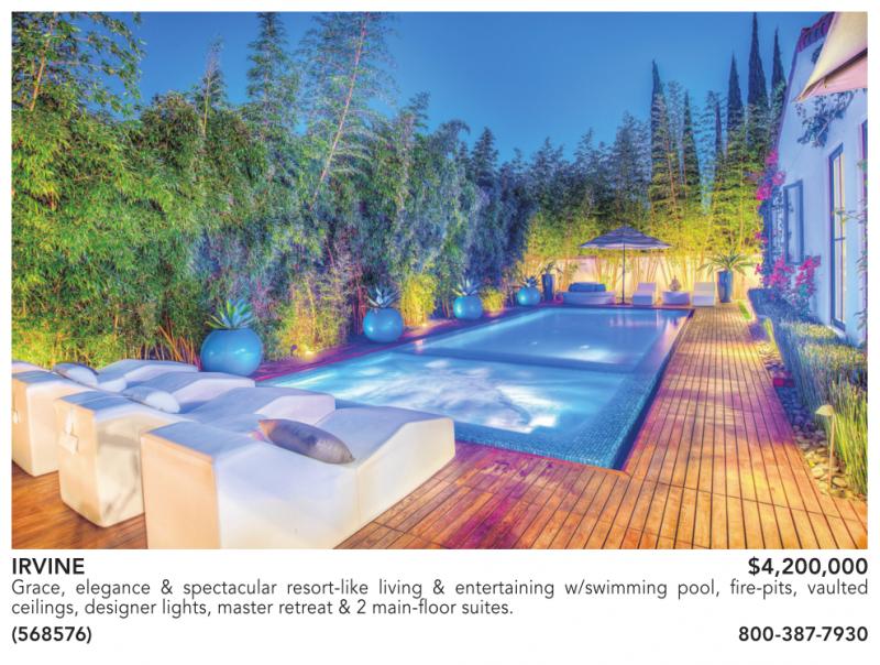 IRVINE $4,200,000 Grace, elegance & spectacular resort-like living & entertaining w/swimming pool, fire-pits, vaulted ceilings, designer lights, master retreat & 2 main-floor suites. (568576) 800-387-7930