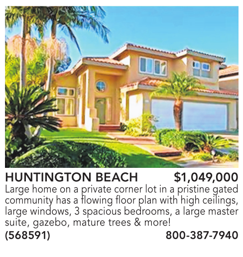 HUNTINGTON BEACH $1,049,000 Large home on aprivate corner lot in apristine gated community has aflowing floor plan with high ceilings, large windows, 3spacious bedrooms, alarge master suite, gazebo, mature trees & more! (568591) 800-387-7940