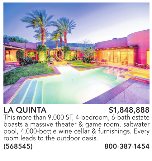 LA QUINTA $1,848,888 This more than 9,000 SF, 4-bedroom, 6-bath estate boasts a massive theater & game room, saltwater pool, 4,000-bottle wine cellar & furnishings. Every room leads to the outdoor oasis. (568545) 800-387-1454