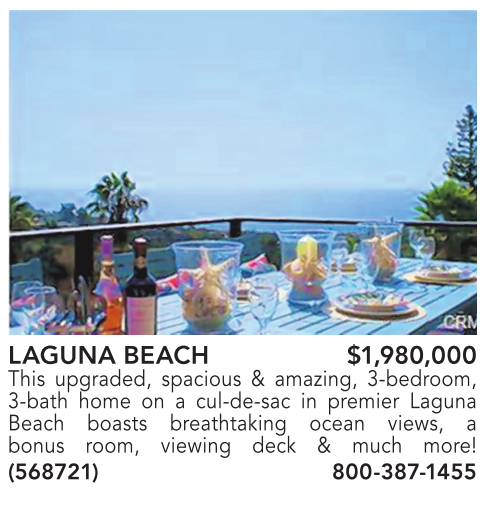 LAGUNA BEACH $1,980,000 This upgraded, spacious & amazing, 3-bedroom, 3-bath home on a cul-de-sac in premier Laguna Beach boasts breathtaking ocean views, a bonus room, viewing deck & much more! (568721) 800-387-1455