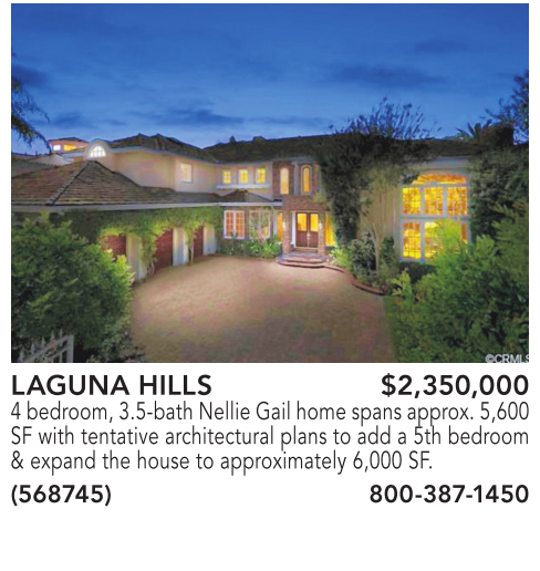 LAGUNA HILLS $2,350,000 4bedroom, 3.5-bath Nellie Gail home spans approx. 5,600 SF with tentative architectural plans to add a5th bedroom &expand the house to approximately 6,000 SF.