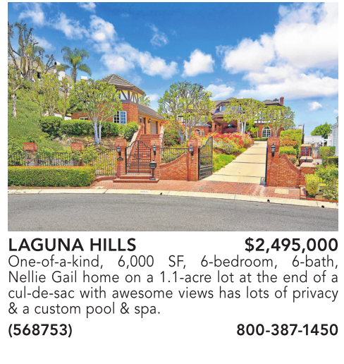 LAGUNA HILLS $2,495,000 One-of-a-kind, 6,000 SF, 6-bedroom, 6-bath, Nellie Gail home on a 1.1-acre lot at the end of a cul-de-sac with awesome views has lots of privacy & a custom pool & spa. (568753) 800-387-1450