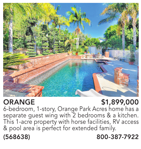 ORANGE $1,899,000 6-bedroom, 1-story, Orange Park Acres home has a separate guest wing with 2 bedrooms & a kitchen. This 1-acre property with horse facilities, RV access & pool area is perfect for extended family. (568638) 800-387-7922