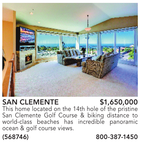 SAN CLEMENTE $1,650,000 This home located on the 14th hole of the pristine San Clemente Golf Course & biking distance to world-class beaches has incredible panoramic ocean & golf course views. (568746) 800-387-1450