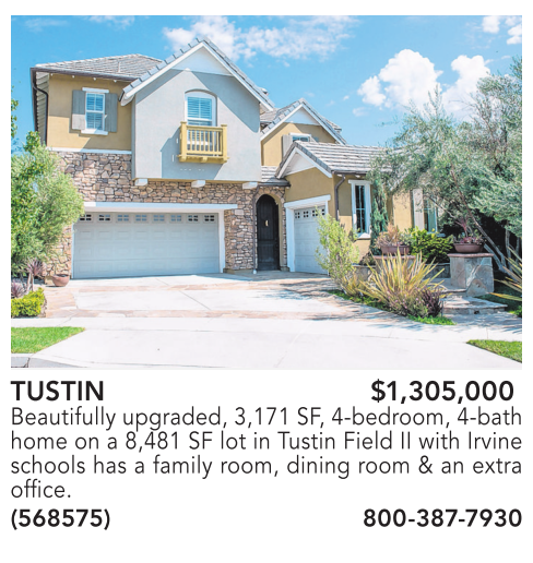 TUSTIN $1,305,000 Beautifully upgraded, 3,171 SF, 4-bedroom, 4-bath home on a 8,481 SF lot in Tustin Field II with Irvine schools has a family room, dining room & an extra office. (568575) 800-387-7930