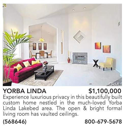 YORBA LINDA $1,100,000 Experience luxurious privacy in this beautifully built custom home nestled in the much-loved Yorba Linda Lakebed area. The open & bright formal living room has vaulted ceilings. (568646) 800-679-5678