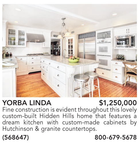 YORBA LINDA $1,250,000 Fine construction is evident throughout this lovely custom-built Hidden Hills home that features a dream kitchen with custom-made cabinets by Hutchinson & granite countertops. (568647) 800-679-5678