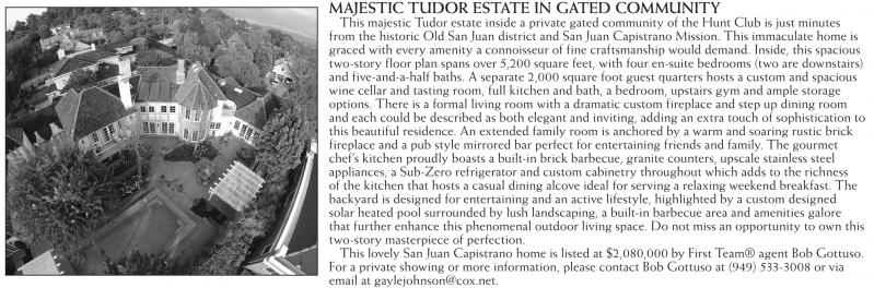 MAJESTIC TUDOR ESTATE IN GATED COMMUNITY This majestic Tudor estate inside a private gated community of the Hunt Club is just minutes from the historic Old San Juan district and San Juan Capistrano Mission. This immaculate home is graced with every amenity a connoisseur of fine craftsmanship would demand. Inside, this spacious two-story floor plan spans over 5,200 square feet, with four en-suite bedrooms (two are downstairs) and five-and-a-half baths. A separate 2,000 square foot guest quarters hosts a custom and spacious wine cellar and tasting room, full kitchen and bath, a bedroom, upstairs gym and ample storage options. There is a formal living room with a dramatic custom fireplace and step up dining room and each could be described as both elegant and inviting, adding an extra touch of sophistication to this beautiful residence. An extended family room is anchored by a warm and soaring rustic brick fireplace and a pub style mirrored bar perfect for entertaining friends and family. The gourmet chef’s kitchen proudly boasts a built-in brick barbecue, granite counters, upscale stainless steel appliances, a Sub-Zero refrigerator and custom cabinetry throughout which adds to the richness of the kitchen that hosts a casual dining alcove ideal for serving a relaxing weekend breakfast. The backyard is designed for entertaining and an active lifestyle, highlighted by a custom designed solar heated pool surrounded by lush landscaping, a built-in barbecue area and amenities galore that further enhance this phenomenal outdoor living space. Do not miss an opportunity to own this two-story masterpiece of perfection. This lovely San Juan Capistrano home is listed at $2,080,000 by First Team® agent Bob Gottuso. For a private showing or more information, please contact Bob Gottuso at (949) 533-3008 or via email at gaylejohnson@cox.net.