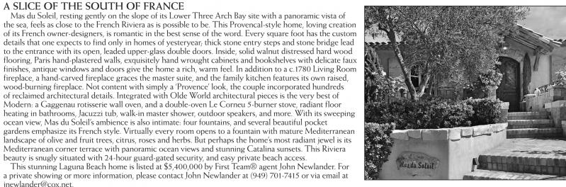 A SLICE OF THE SOUTH OF FRANCE Mas du Soleil, resting gently on the slope of its Lower Three Arch Bay site with a panoramic vista of the sea, feels as close to the French Riviera as is possible to be. This Provencal-style home, loving creation of its French owner-designers, is romantic in the best sense of the word. Every square foot has the custom details that one expects to find only in homes of yesteryear; thick stone entry steps and stone bridge lead to the entrance with its open, leaded upper-glass double doors. Inside, solid walnut distressed hard wood flooring, Paris hand-plastered walls, exquisitely hand wrought cabinets and bookshelves with delicate faux finishes, antique windows and doors give the home a rich, warm feel. In addition to a c.1780 Living Room fireplace, a hand-carved fireplace graces the master suite, and the family kitchen features its own raised, wood-burning fireplace. Not content with simply a ‘Provence’ look, the couple incorporated hundreds of reclaimed architectural details. Integrated with Olde World architectural pieces is the very best of Modern: a Gaggenau rotisserie wall oven, and a double-oven Le Corneu 5-burner stove, radiant floor heating in bathrooms, Jacuzzi tub, walk-in master shower, outdoor speakers, and more. With its sweeping ocean view, Mas du Soleil’s ambience is also intimate: four fountains, and several beautiful pocket gardens emphasize its French style. Virtually every room opens to a fountain with mature Mediterranean landscape of olive and fruit trees, citrus, roses and herbs. But perhaps the home’s most radiant jewel is its Mediterranean corner terrace with panoramic ocean views and stunning Catalina sunsets. This Riviera beauty is snugly situated with 24-hour guard-gated security, and easy private beach access. This stunning Laguna Beach home is listed at $5,400,000 by First Team® agent John Newlander. For a private showing or more information, please contact John Newlander at (949) 701-7415 or via email at jnewlander@cox.net.