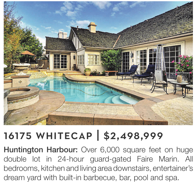 Huntington Harbour: Over 6,000 square feet on huge double lot in 24-hour guard-gated Faire Marin. All bedrooms, kitchen and living area downstairs, entertainer’s dream yard with built-in barbecue, bar, pool and spa.