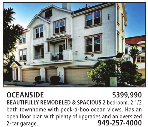 bath townhome with peek-a-boo ocean views. Has an open floor plan with plenty ofupgrades and anoversized 2-car garage. 949-257-4000