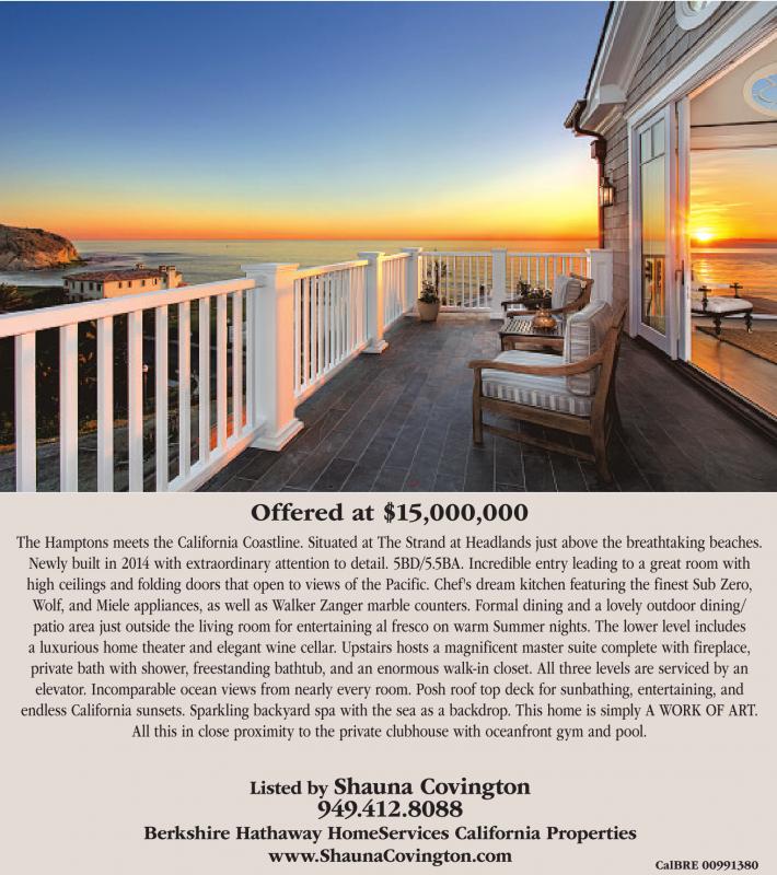 Offered at $15,000,000 The Hamptons meets the California Coastline. Situated at The Strand at Headlands just above the breathtaking beaches. Newly built in 2014 with extraordinary attention to detail. 5BD/5.5BA. Incredible entry leading to a great room with high ceilings and folding doors that open to views of the Pacific. Chef's dream kitchen featuring the finest Sub Zero, Wolf, and Miele appliances, as well as Walker Zanger marble counters. Formal dining and a lovely outdoor dining/ patio area just outside the living room for entertaining al fresco on warm Summer nights. The lower level includes a luxurious home theater and elegant wine cellar. Upstairs hosts a magnificent master suite complete with fireplace, private bath with shower, freestanding bathtub, and an enormous walk-in closet. All three levels are serviced by an elevator. Incomparable ocean views from nearly every room. Posh roof top deck for sunbathing, entertaining, and endless California sunsets. Sparkling backyard spa with the sea as a backdrop. This home is simply A WORK OF ART. All this in close proximity to the private clubhouse with oceanfront gym and pool. Listed by Shauna Covington 949.412.8088 Berkshire Hathaway HomeServices California Properties www.ShaunaCovington.com CalBRE 00991380
