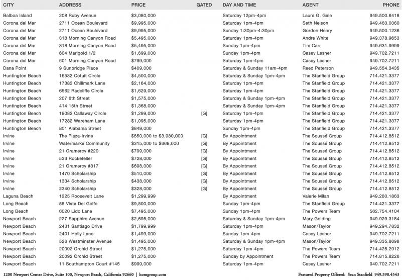 Balboa Island 208 Ruby Avenue $3,080,000 Saturday 12pm-4pm Laura G. Gale 949.500.6418 Corona del Mar 2711 Ocean Boulevard $9,995,000 Saturday 1pm-4pm Seth Nelson 949.463.0360 Corona del Mar 2711 Ocean Boulevard $9,995,000 Sunday 1:30pm-4:30pm Gordon Henry 949.500.1236 Corona del Mar 318 Morning Canyon Road $5,495,000 Saturday 1pm-4pm Andre White 949.378.9653 Corona del Mar 318 Morning Canyon Road $5,495,000 Sunday 1pm-4pm Tim Carr 949.631.9999 Corona del Mar 604 Marigold 1/2 $1,699,000 Sunday 1pm-4pm Casey Lesher 949.702.7211 Corona del Mar 501 Morning Canyon Road $799,000 Saturday 1pm-4pm Casey Lesher 949.702.7211 Dana Point 9 Sunbridge Place $409,000 Saturday & Sunday 11am-4pm Reed Peterson 949.554.3435 Huntington Beach 16532 Cotuit Circle $4,500,000 Saturday & Sunday 1pm-4pm The Stanfield Group 714.421.3377 Huntington Beach 17382 Chillmark Lane $2,164,000 Saturday 1pm-4pm The Stanfield Group 714.421.3377 Huntington Beach 6562 Radcliffe Circle $1,629,000 Saturday 1pm-4pm The Stanfield Group 714.421.3377 Huntington Beach 207 6th Street $1,575,000 Saturday & Sunday 1pm-4pm The Stanfield Group 714.421.3377 Huntington Beach 414 15th Street $1,368,000 Saturday & Sunday 1pm-4pm The Stanfield Group 714.421.3377 Huntington Beach 19082 Callaway Circle $1,299,000 [G] Saturday 1pm-4pm The Stanfield Group 714.421.3377 Huntington Beach 17282 Wareham Lane $1,095,000 Saturday 1pm-4pm The Stanfield Group 714.421.3377 Huntington Beach 801 Alabama Street $849,000 Sunday 1pm-4pm The Stanfield Group 714.421.3377 Irvine The Plaza-Irvine $650,000 to $3,980,000 [G] By Appointment The Soussé Group 714.412.8512 Irvine Watermarke Community $315,000 to $668,000 [G] By Appointment The Soussé Group 714.412.8512 Irvine 21 Gramercy #220 $799,000 [G] By Appointment The Soussé Group 714.412.8512 Irvine 533 Rockefeller $728,000 [G] By Appointment The Soussé Group 714.412.8512 Irvine 21 Gramercy #317 $698,000 [G] By Appointment The Soussé Group 714.412.8512 Irvine 1470 Scholarship $510,000 [G] By Appointment The Soussé Group 714.412.8512 Irvine 1334 Scholarship $438,000 [G] By Appointment The Soussé Group 714.412.8512 Irvine 2340 Scholarship $328,000 [G] By Appointment The Soussé Group 714.412.8512 Laguna Beach 1225 Roosevelt Lane $1,299,999 By Appointment Valerie Milan 949.280.1863 Long Beach 55 Vista Del Golfo $9,500,000 Sunday 1pm-4pm The Stanfield Group 714.421.3377 Long Beach 6020 Lido Lane $7,495,000 Sunday 1pm-4pm The Powers Team 562.754.4104 Newport Beach 227 Sapphire Avenue $2,695,000 Saturday & Sunday 1pm-4pm Mary Golding 949.929.3184 Newport Beach 2431 Santiago Drive $1,799,999 Saturday 1pm-4pm Mason/Taylor 949.294.7832 Newport Beach 2401 Holly Lane $1,499,000 Sunday 1pm-4pm Casey Lesher 949.702.7211 Newport Beach 526 Westminster Avenue $1,495,000 Saturday & Sunday 1pm-4pm Mason/Taylor 949.335.8698 Newport Beach 20092 Orchid Street $1,275,000 Saturday 1pm-4pm The Powers Team 714.425.2912 Newport Beach 20092 Orchid Street $1,275,000 Sunday by Appointment The Powers Team 714.815.8226 Newport Beach 11 Southampton Court #145 $999,000 Saturday 1pm-4pm Casey Lesher 949.702.7211